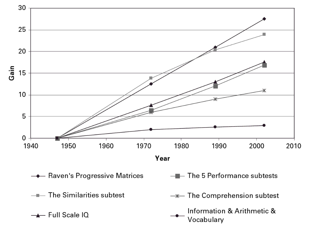 The Flynn Effect is described as the consistent generational gains in intelligence discovered by James Flynn. It is typically considered a 10 point increase in IQ per generation, and was a famous mystery in intelligence research, until recently.