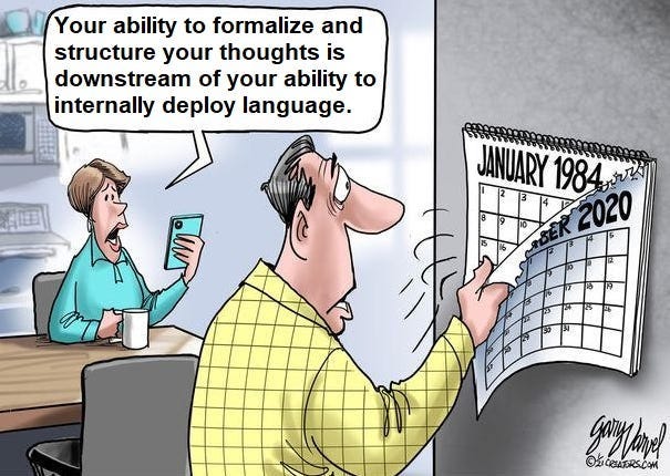 If I ask you to think through a problem you don’t think in symbols, numbers, or any other representation. You think in words, and therefore your ability to think relies on your ability to deploy words.